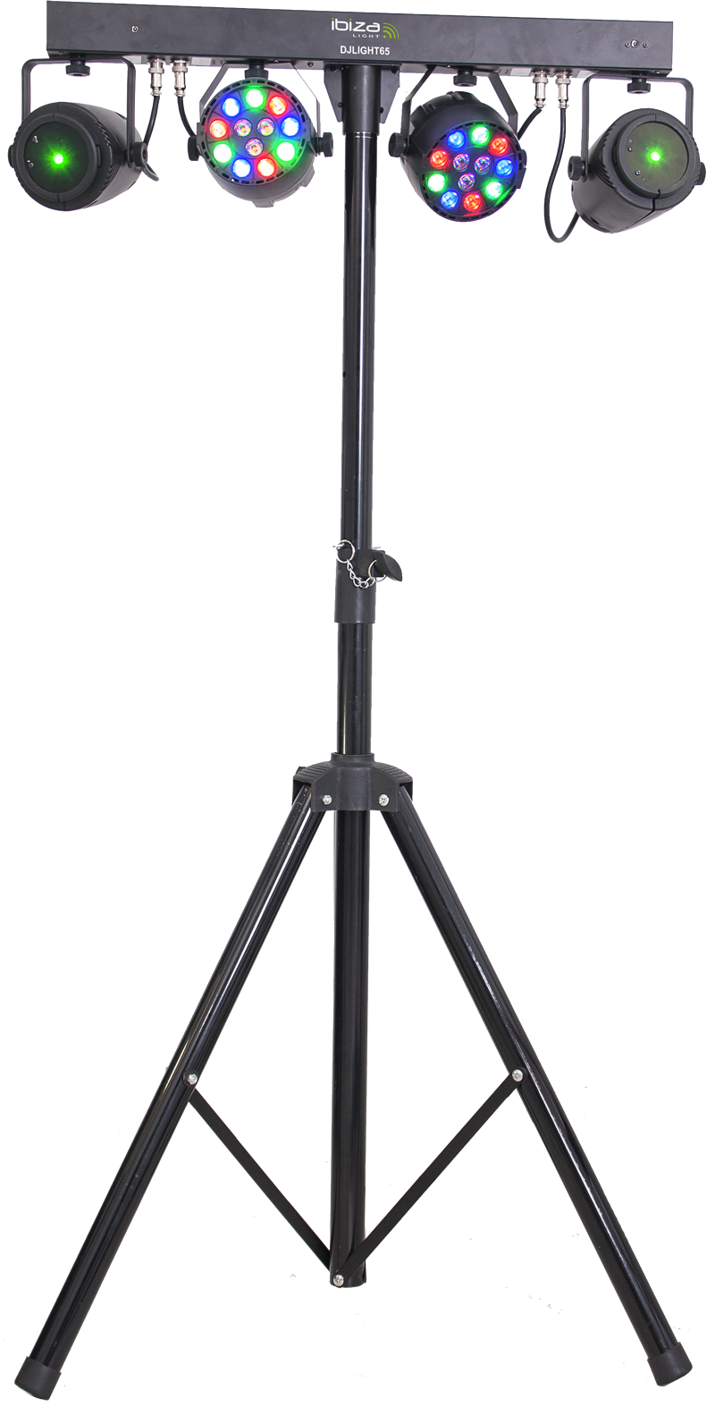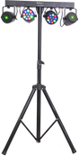 Komplet lysbar inkl. skridsikkert stativ i sort finish til nem opsætning. Sættet inkluderer 2x LED parlamper med 12x 1W RGBW LEDer og 2x 130mW lasere med flotte stjernemønstre i røde og grønne farver