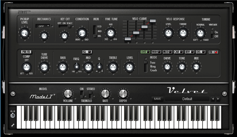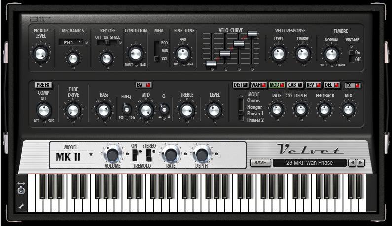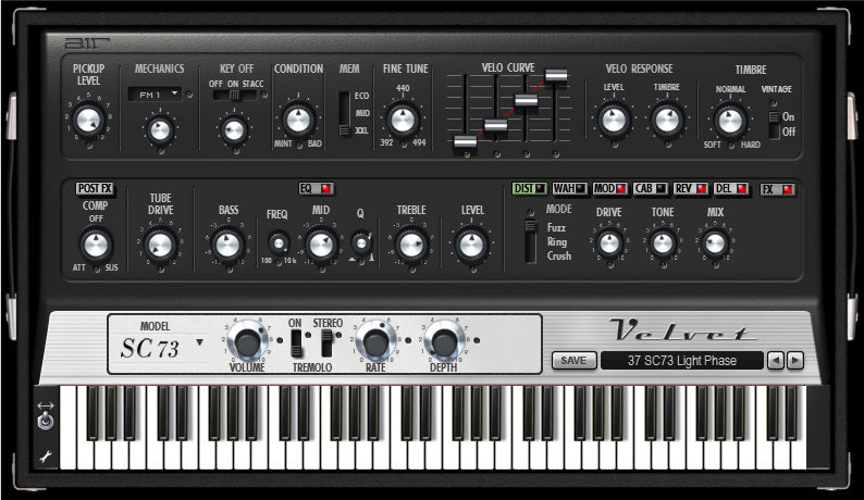 Velvet er et virtuelt elektronisk klaver, der kombinerer fem legendariske elektriske klaverer fra 60'erne og 70'erne i ét alsidigt instrument. Baseret på Fender Rhodes Suitcase, Fender Rhodes MK I og MK II Stage Pianos, Wurlitzer 200A og Hohner Pianet-T, emulerer Velvet præcist lydkvaliteten, responsen og nuancerne fra hvert originalinstrument for at bringe dine klavertracks til live.