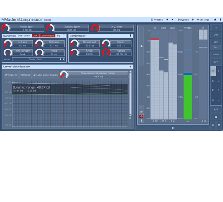 MModernCompressor tilbyder naturligvis de typiske kontrolparametre, gain reduction, output peak og loudness værdier, men det viser også et niveau distributionsdiagram, hvorfra plugin'et kan analysere signalet og faktisk opsætte compressorparametre automatisk!