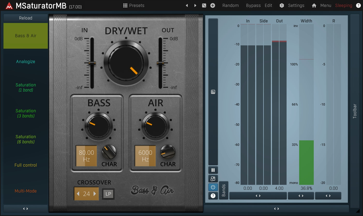 Saturation er en meget speciel type af glat distortion, kendt fra rør og bånd. Det kan tilføre noget harmonisk smag, forbedre bas- og sub-bassindhold og meget mere. MSaturatorMB er et ekstremt musikalsk og alsidigt saturation plugin, som også indeholder en digital harmonisk generator. MSaturatorMB kombinerer det bedste fra både den analoge og digitale verden.