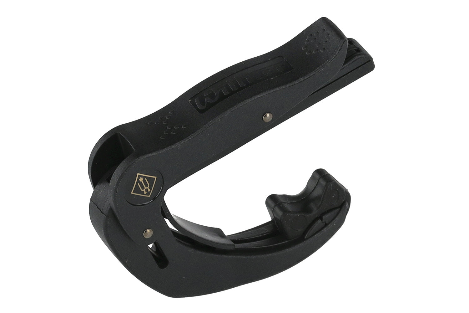 - Press at the pressure point (near the hinge) to lock, press at the pressure point (at the tip of the capo) to open
