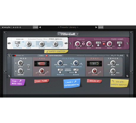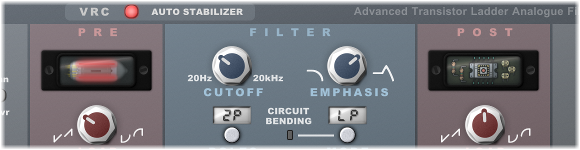 - Analogue modeled transistor-based and tube-based saturation and overdrive circuits with separate load controls for pre-filter and post-filter stages