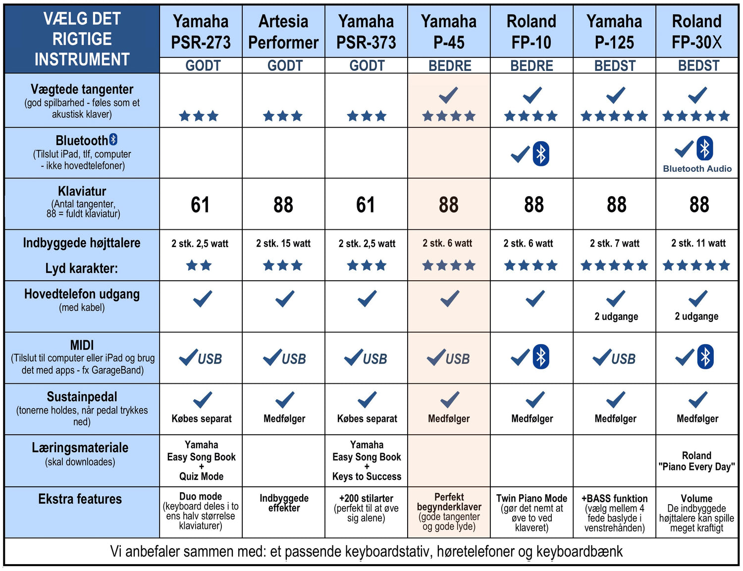 - Pakke med P-45, sustainpedal, nodeholder, kraftigt keyboardstativ og gode hovedtelefoner.