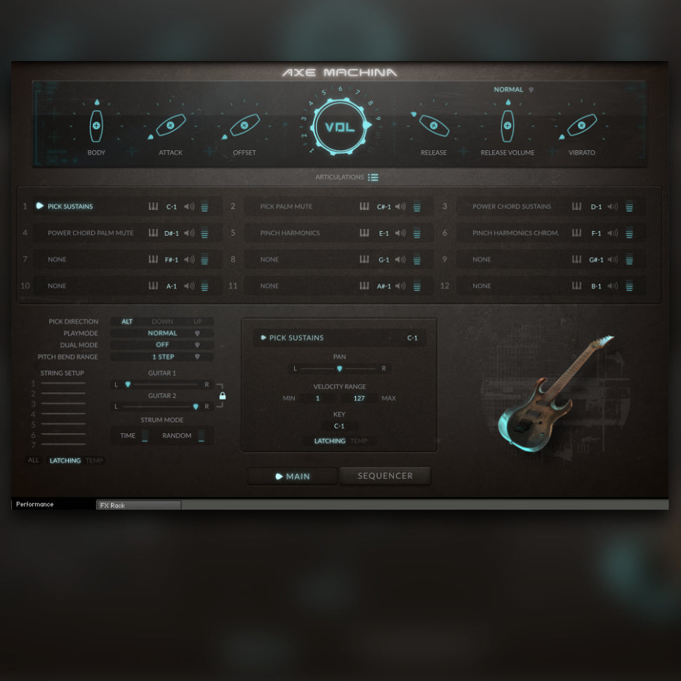 Vi har sampled enkelttoner og power chord sustain med palm mute variationer. Du vil også finde et udvalg af SFX, såsom pinch harmonics, mutes, pick scrapes med langsomme, medium og lange, fret noise, chokes, rakes og slides. Juster din drømmetone ved at sende vores pure D.I. signal gennem dine yndlings amp simulator plugins, eller brug vores custom reamped tone, skabt med Neural DSP software. Vores fleksible GUI giver dig adgang til real-time artikulationsvalg og performance funktioner, key-switch og mapping muligheder, arpeggiator, auto-strummer, sequencer og fuld FX rack, alt sammen pakket ind i en intuitiv og tilpasselig brugergrænseflade.