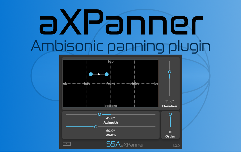 aXPanner er en Ambisonic encoder, der giver dig kontrol over azimuth og elevation af lydkilden samt bredden mellem de stereoinputkanaler. Valget af to interfaces (equirectangular og top-down) gør det nemt at placere din lyd i rummet for at skabe din immersive audio verden. Den fås i tre variationer: første orden, tredje orden og tiende orden.