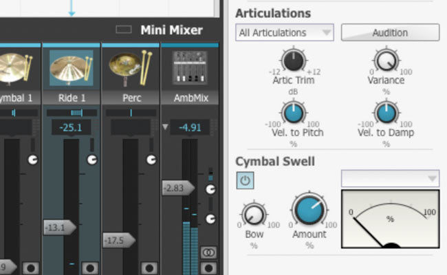 Den interne BFD3 mixing engine har DCAM-modelleret kompression, filtrering og andre effekter sammen med fantastisk klingende EQ og algoritmiske rumklang. Du kan endda bruge et eksternt signal som en kompressions sidechain-kilde.