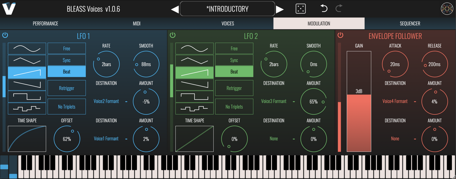 Synth-stil modulatorer, herunder to LFO'er, en envelope follower og en pattern sequencer, tilføjer dynamisk variation. En intelligent pitch correction algoritme justerer stemmer til en valgt toneart og skala. Hver stemme har en uafhængig output buss til fleksibel mixing og effekter, sammen med master output.
