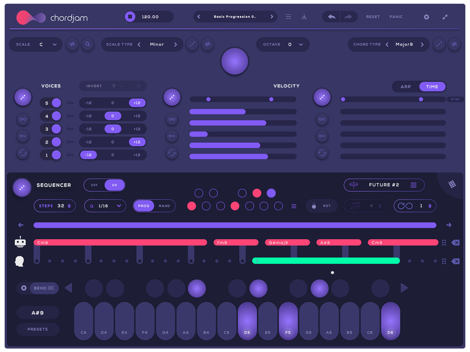 Brugere kan vælge mellem en række forskellige skala- og akkordtyper, voicing-parametre samt både rytmer og progressioner, eller lade dens kraftfulde sequencer fremkalde et ubegribelig antal progressioner baseret på enhver kombination af indstillinger for at servere uforudsigelige, men altid musikalske variationer...