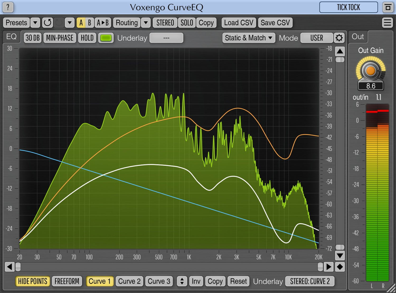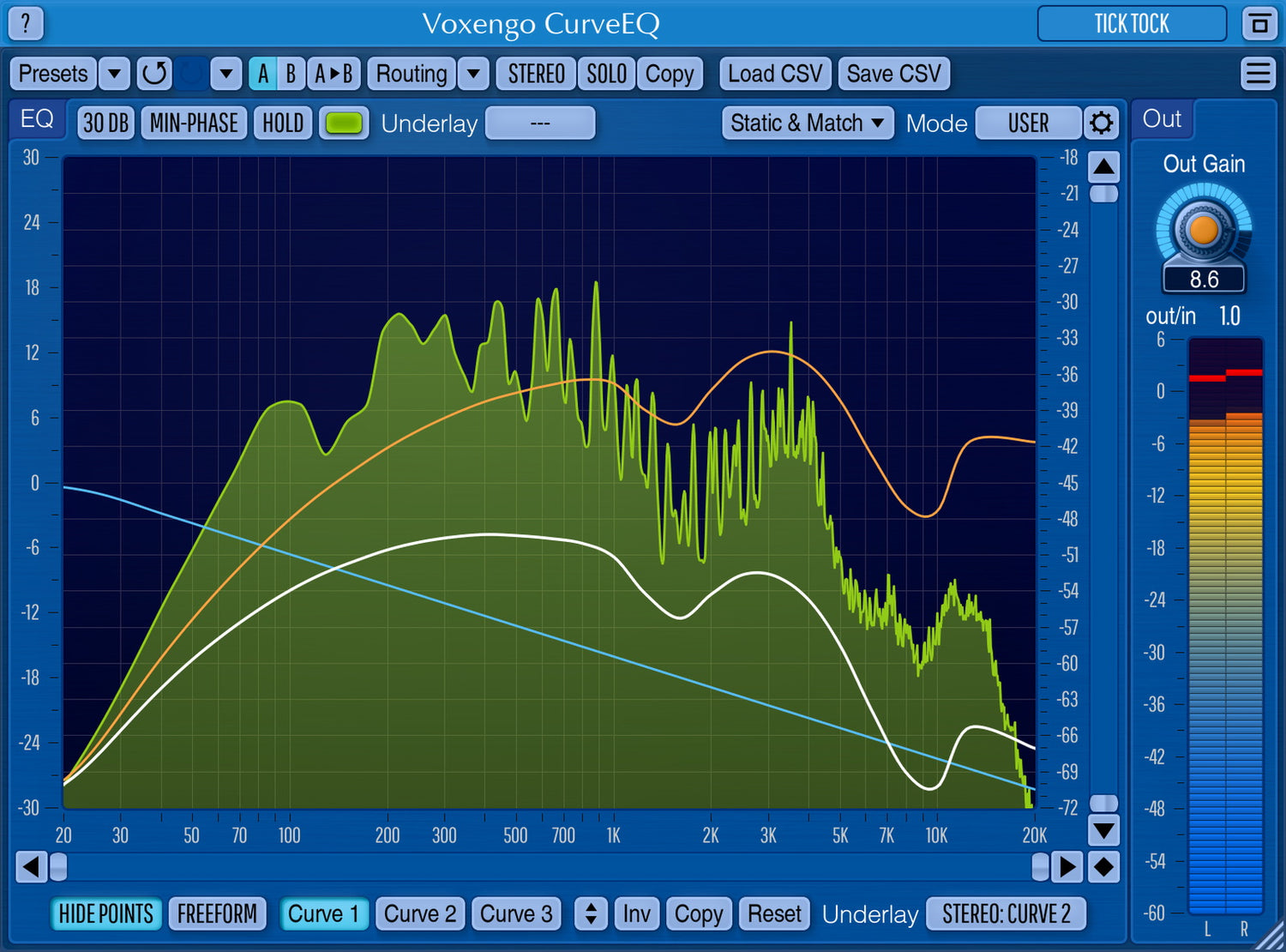 CurveEQ implementerer spectrum matching teknologi, der gør det muligt for dig at overføre spektrets form fra en optagelse til en anden. Med andre ord giver det dig mulighed for at "kopiere" frekvensbalancen fra eksisterende, tidstestede mixes, så andre mixes, der stadig er under udvikling, kan få en chance for at lyde bedre. Denne teknologi hjælper også i høj grad ved musikmastering, da den nemt mindsker eventuelle dramatiske forskelle i frekvensbalancen mellem forskellige numre.
