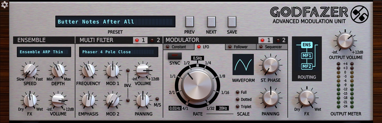 Godfazers Ensemble-sektion tilbyder et bredt udvalg af delay- og amplitudemodulerende vintage-enheds-emuleringer, herunder BBD-baserede choruses, Solina-stil ensembles og rotary speakers, samt en række originale tremolos, auto-panners og andre modeller. Men det er kun begyndelsen! Sammen med Ensemble har to identiske Multi Filters hver 40 spektakulært forskellige filtertyper, fra dual shelving EQs, low/high/band-pass modeller og formantfiltre, til et omfattende udvalg af vintage og moderne phasers.