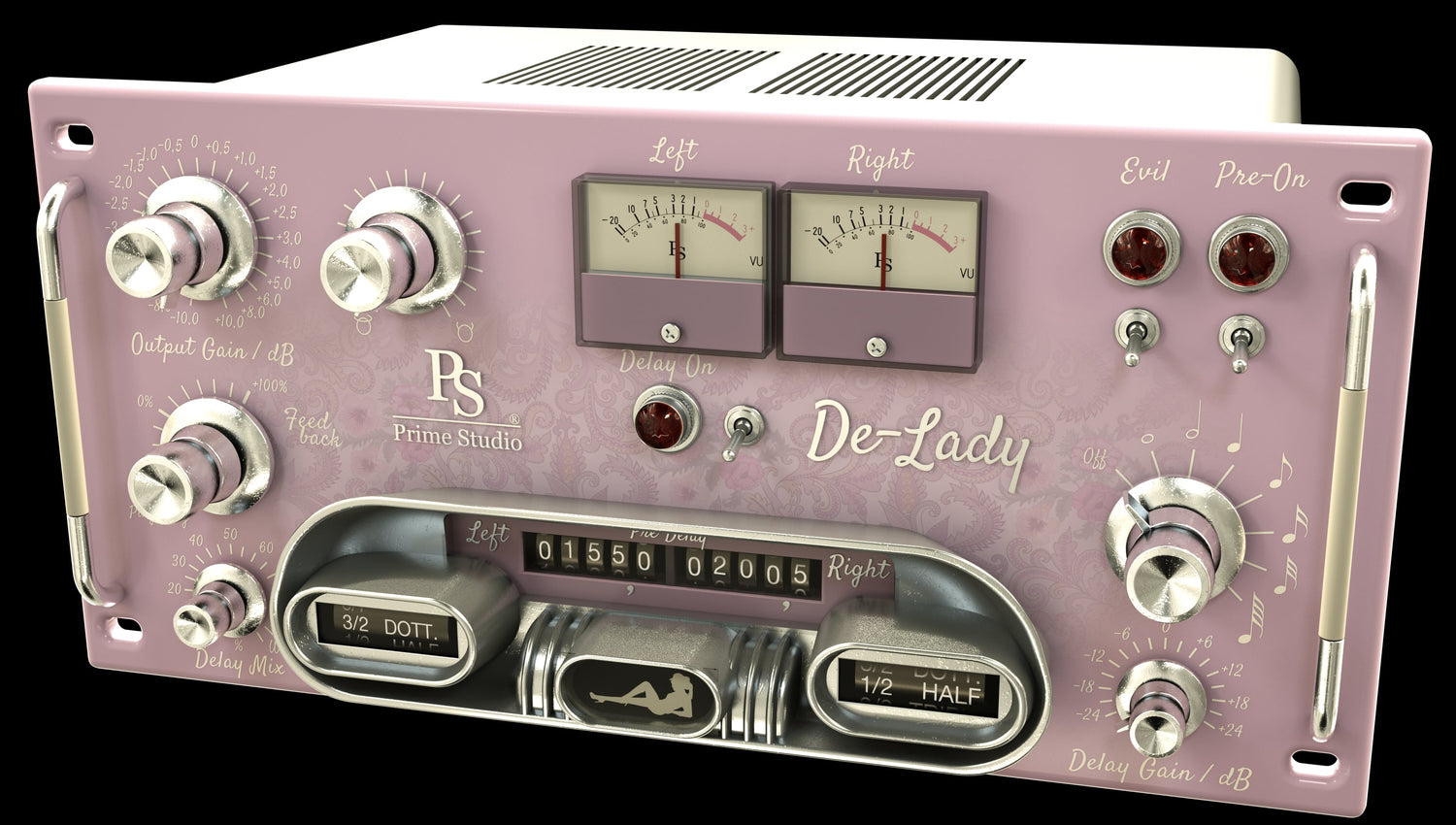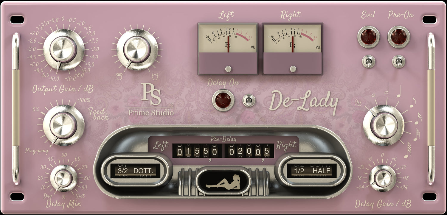 De-Lady kombinerer lyden af vores berømte Charly Triple Six Limited summing tool, baseret på en analog tube summing enhed, der er kraftigt modificeret i henhold til vores specifikationer, og en enkel stereo delay effekt, der tilbyder typisk funktionalitet.