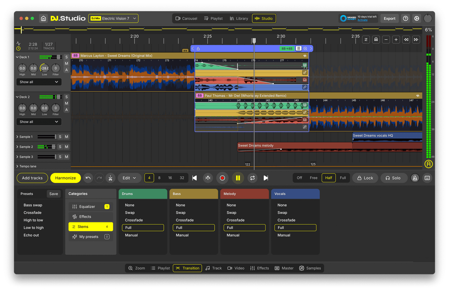 - Skær og isoler trommer, bas, melodi og vokaler til mashups eller udvidede redigeringer.