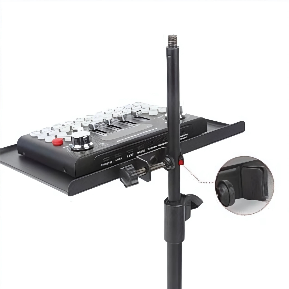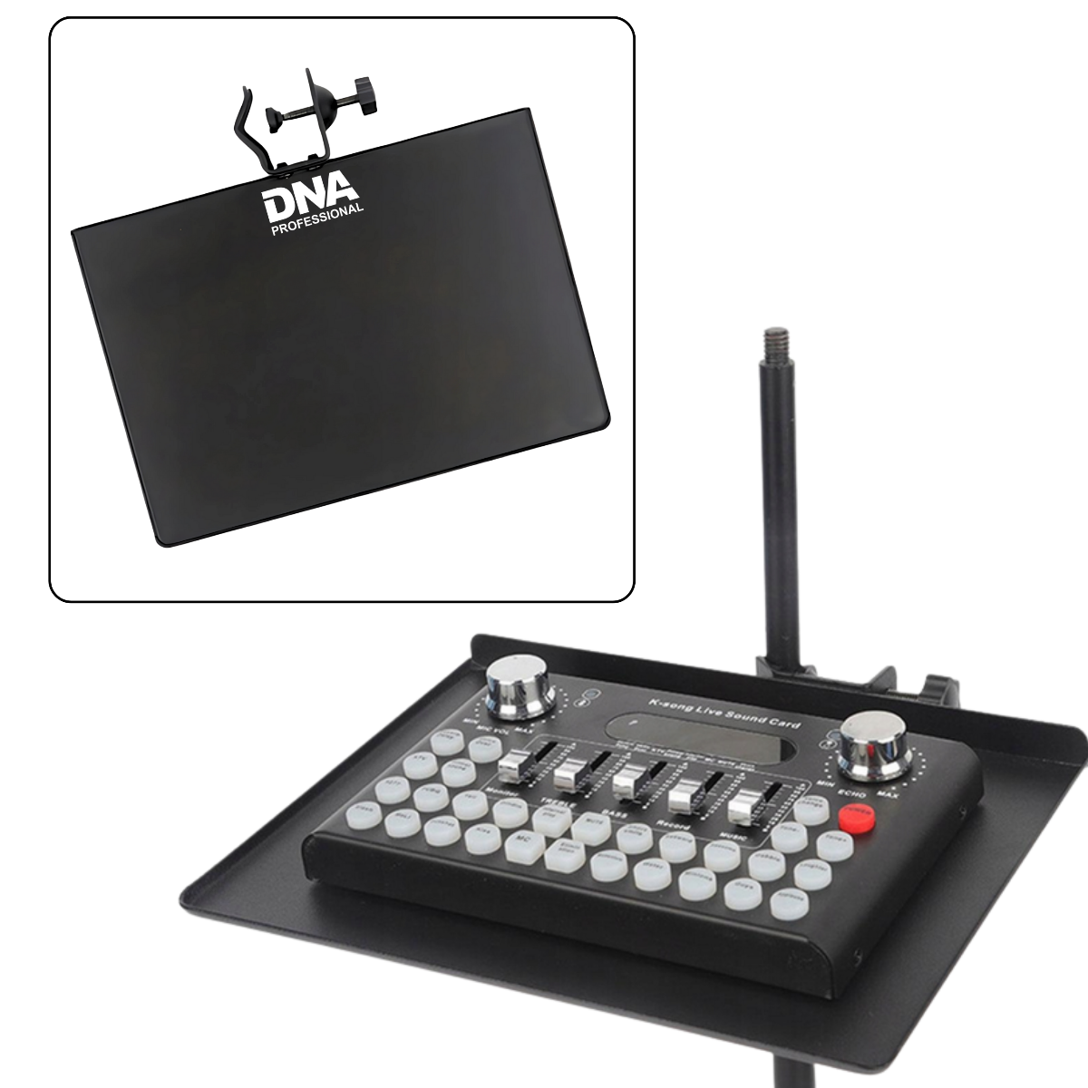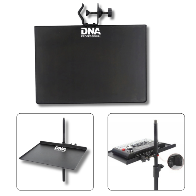 DNA SCT1 er en kompakt og stabil stand-hylde designet til montering på mikrofonstativer eller lysstativer. Den giver en praktisk og sikker plads til udstyr som audio interfaces, små mixere, tablets, guitarpedaler eller andre studietilbehør under optagelser, livestreams eller liveoptrædener.