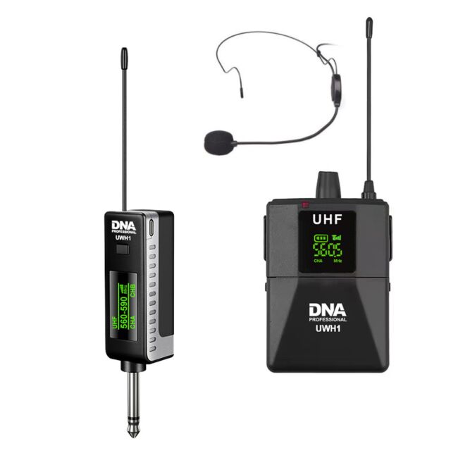 Wireless sound system UHF 560590 MHzDNA UWH 1 is a very easytouse wireless microphone system, which includes a wireless headset dynamic microphone with bodypack and a small, compact UHF receiver that plugs directly into an amplifier or audio mixer socket 6.3 mm jack. The set operates in the 560 to 590 MHz range. It is ideal as a sound system for vocalists, bands, event companies, game entertainers, karaoke microphone as well as a wireless system for various types of cultural and educational institutions.Includedheadset microphone,bodypack transmitter,receiver,2 AA batteries,6.3 mm 3.5 mm jack adapter,USB AC power cable,user manual.nbsp Multipurpose headset wireless microphone with bodypackThe bodypack is powered by two 1.5volt AA batteries, which allow it to operate continuously for up to 8 hours. The transmitter has a convenient power potentiometer, an infrared receiver and an easytoread LCD display showing the current operation channel, frequency and quality of the transmitted signal as well as the current battery level. The bodypack is equipped with a 3.5 mm jack input so you can easily connect it to a headset microphone! The cardioid polar pattern of the headset microphone ensures that the amount of unwanted sound entering the transducer from the environment is minimal. Thanks to this and the perfectly matched frequency response, the microphone and bodypack perform perfectly in all conditions.nbsp Easytouse wireless receiverThe UHF wave receiver is equipped with a highsensitivity antenna and a simple 6.3 mm jack connector so it can be plugged directly into an amplifier or stage mixer socket. This is a very convenient solution that eliminates the need for additional cables. The receiver control panel houses a switch and a power socket as well as an easytoread display showing the current operation channel, frequency and quality of the transmitted signal.nbsp Microphone for vocalists? Not only that!DNA UWH 1 is an ideal set for bands, singers singing solo as well as people and companies organizing panel discussions, training sessions and various thematic meetings. It is also a great wireless microphone for karaoke. If you are wondering which wireless microphone to choose, you should definitely pay attention to the DNA UWH 1 set. This is a widely used wireless microphone along with a compact pocket receiver from the renowned DNA Professional brand. The microphone is designed for SOLO use due to the realtime frequency settings, only one microphone can operate!nbspTechnical specificationPower consumption 5WFuse 1AFrequency range UHF 560 590 MHzChannels 30Automatic pairing yesModulation mode digital frequency modulationSampling frequency 48 kHzLatency lt2.5msSignaltonoise ratio gt98dBTHD lt1.0 1 kHzOperation range up to approx. 50 mRF carrier stability 0.005 10degC 50degCCharging time approx. 1 hr.Operation time approx. 8 hrs.ReceiverRechargeable battery 18650 lithiumion, 1200 mAh, 3.7VPower consumption 80mADimensions 11.4 x 3.7 x 2.4 cmMicrophoneType dynamic, headsetPolar pattern cardioidCable connector 3.5 mm jackFrequency response 7518000Hz 3dBCable length 1.2 mBodypackPower supply 2 AA batteries 1.5VInput 3.5 mm jackDimensions with antenna 3.4 x 2.7 x 21.8 cmnbspPackaging dimensions 30 x 14.3 x 5.8 cmNet weight 0.2 kgGross weight 0.35 kg