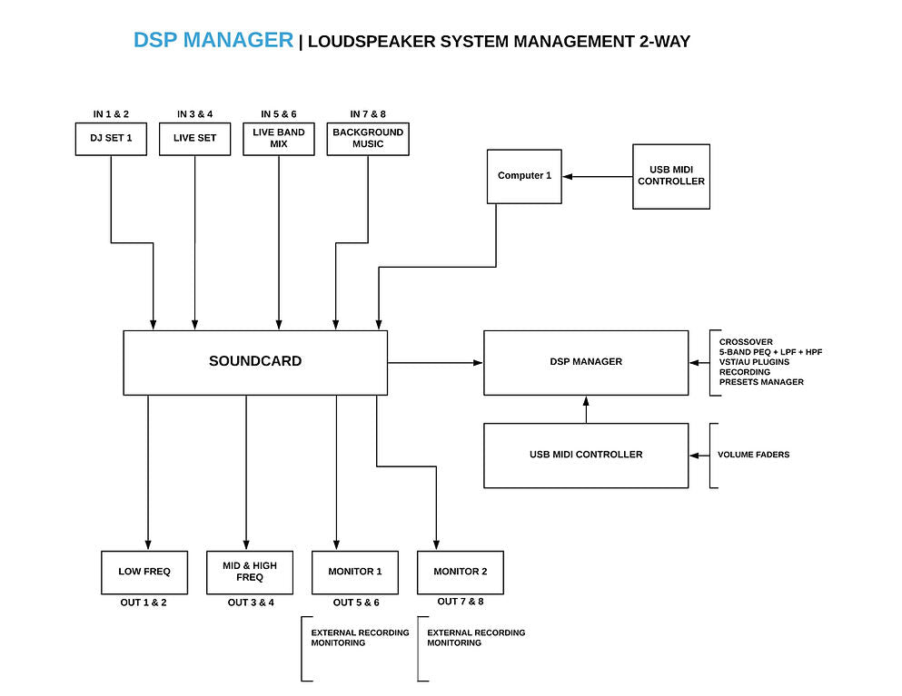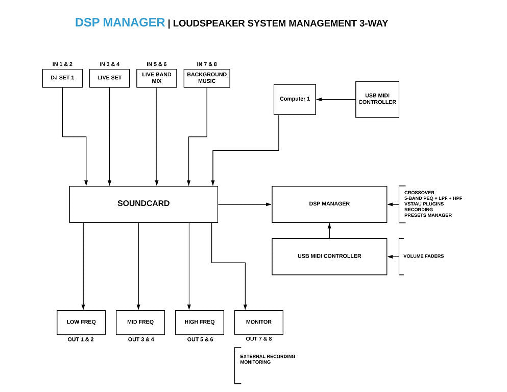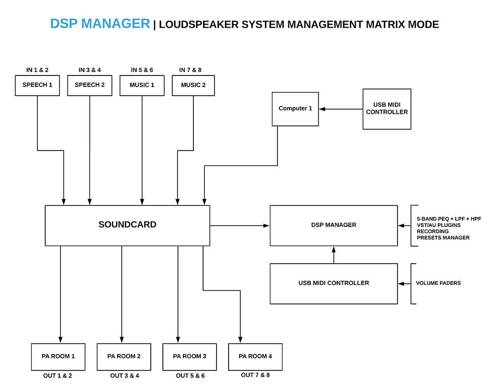 DSP Manager gør det muligt at administrere komplekse højttalersystemer (2-vejs og 3-vejs) ved hjælp af en computer, lydkort, midi controller og bearbejde audio gennem vst/au plugins i stedet for en DSP hardwareenhed med crossover filtre.