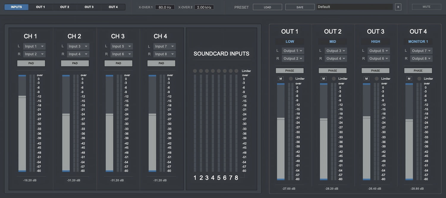 - Outputs: Op til 4 stereo audioudgangskanaler. Hver udgangskanal inkluderer 5-Band Parametric EQ, LPF, HPF, forsinkelser, 4 vst/au plugin sektioner & en indbygget brickwall limiter for at undgå clipping og distortion.