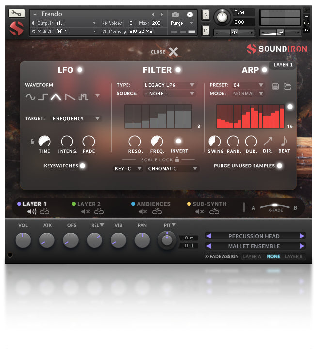 - Flexible and intuitive multi-layer user interface controls, with LFO, filter, glide, and arpeggiator