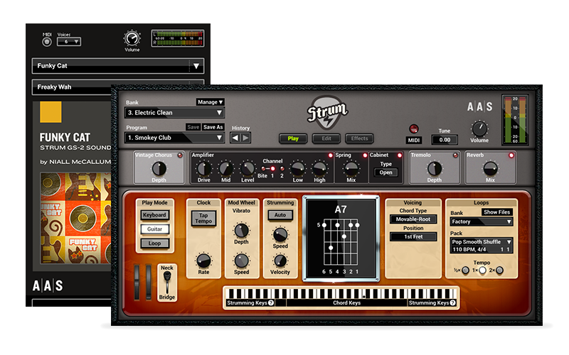 Med Funky Cat transporterer lyddesigner Niall McCallum Strum GS-2 til funkens gyldne æra — de grundlæggende eksperimenter i groove fra ikoner som Sly & The Family Stone, James Brown og The Meters. Fra hakkede 16.-nots riffs fyldt med tætte, dæmpede stød til glatte rytmiske akkordprogressioner, tager dette kalejdoskopiske nye sæt det allerbedste fra spillets forfædre og sender hele pakken direkte ind i nutiden.