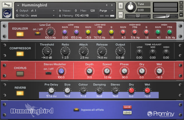 * Hummingbird bruger det tabsfrie samplekomprimeringsformat 'NCW' med realtidskodning. Datastørrelsen efter installationen er ca. 40,3 GB, hvilket svarer til 80 GB af .wav filer.