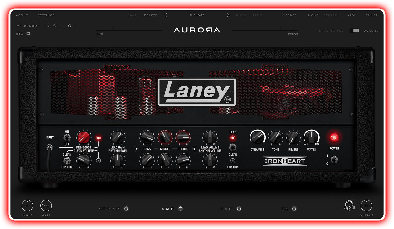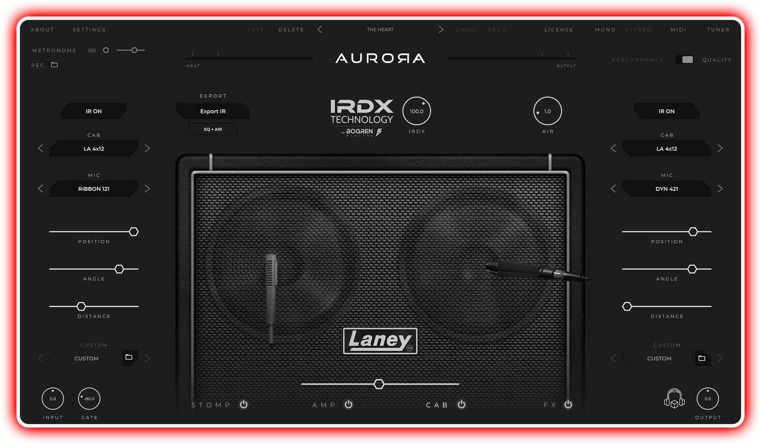 Med IRONHEART-PLUGIN får du valget mellem 2 fremragende kabinetter fra Laney serien, forskellige mikrofonmodeller at vælge imellem, en ekstern IR loader og en AIR-knap for ekstra tilstedeværelse.