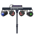 LIGHT4ME TBAR LED PAR FLOWER BALL LASER UV STROBE is a mobile LED lighting set. The system is ideal for various types of events, offering rich and varied lighting effects. The set consists oftwo PAR spotlights ndash each equipped with 3 LEDs with a capacity of 4 W operating in RGBW color paletteUVW bar with stroboscope function, equipped with 6 LEDs with the power of 4 W, emitting ultraviolet and white lightflower light effect resembling a disco ball, equipped with 4 LEDs 3 W, emitting light in RGBW color palettelaser ndash red with power of 120 mW and green with power of 30 mWa solid, stable tripod extensible to a height of 180 cm.Stage lighting is mounted on a transverse bar with a width of 80 cm. In its lower part, there are 3pin sockets for powering the individual devices and enabling their control via DMX protocol. The rear part houses the main power supply socket, a 3pin XLR input and output socket for the transmission of DMX signals and a control panel in the form of a digital LED display and four buttons Menu, Up, Down, Enter. With its help, we can select one of several modes of system operationauto, in which the unit functions automatically using builtin operating programssound, where the set synchronises its operation with the music through a builtin, very sensitive microphonemasterslave, when LED stage effects are connected in series via DMX sockets and cables, and the operation of the first unit connected to the line is copied by other unitsDMX, when external controllers and consoles are used to control the operation of a single unit or a group of units.The small weight and size of the multieffect make it an ideal portable set for a mobile DJ or a band. It can be successfully used on small stages, wedding halls, dance clubs and discos, as well as during various types of entertainment events. This is inexpensive lighting set available at great price from our store!nbspnbspTechnical specificationPower supply AC100240V, 5060HzPower consumption 80WFuse 3ALed PAR 2 spotlights 3x4W RGBWUV bar 6x4W UVWFlower ball 4x3W RGBWLaser red 120mW, green 30mWOperation modes auto, sound, masterslave, DMX512DMX channels 312Control panel LED display 4 buttons, remoteWorking temperature from 20degC to 40degCDMX connectors 3pinPower socket IECDimensions 80 x 26.5 x 17 cm without standWeight 8.5 kgOriginal packaging and filling.