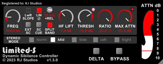 Limited-S er en “fixed threshold” type De-Esser, der arbejder på peak signal niveauer meget lig en limiter. Den forsøger ikke at spore det samlede signal og dæmpe, hvad den “mener” er overdreven sibilance. De-Essers af den type har tendens til at overkomprimere førende sibilance (producerer lisping) mens de underkontrollerer efterfølgende sibilance. Limited-S fanger derimod kun de højeste og mest stødende sibilance toppe. (Tærsklen kan automatiseres, hvis ønskes). Når den bruges på stereo tracks, kan Limited-S operere på hele mixet, kun Mids, kun Sides eller kun Left eller Right. Dette muliggør anvendelser i både mixing og mastering, såsom de-essing af vokaler i en master (typisk centreret) mens siderne forbliver urørt. Limited-S’s High Lift kontrol tillader at tilføje lysstyrke til et mix, mens den samtidig kontrollerer overdrevne høje frekvenser. Fantastisk til vokaler eller til at lysne en master.