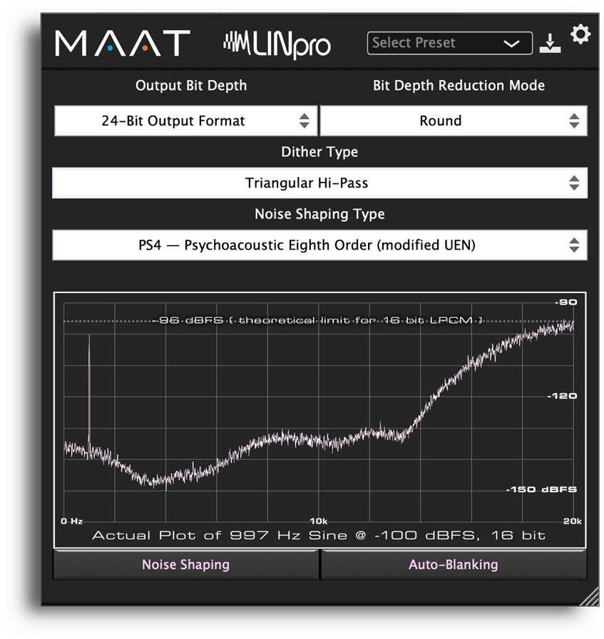 Ved at dele den samme brugergrænseflade er MAAT’s to-kanals og multikanals LIN-familie dit endelige link mellem produktion og levering. Med mulighed for reduktion af ordlængde og syv støjformningsspektrer tilpasset både analog og digital levering af aktiver, er LIN meget justerbar for at hjælpe med at skabe din egen signatur “lyd.” Udover TPD og vægtet TPD, har LINpro og LINSurround fire nyudviklede femte, ottende og niende ordens psykoakustiske støjformningsmuligheder. Som med alle dithering-mekanismer skal LIN være den aller sidste plug-in instans, lige før konvertering til det endelige, faste punktformat.