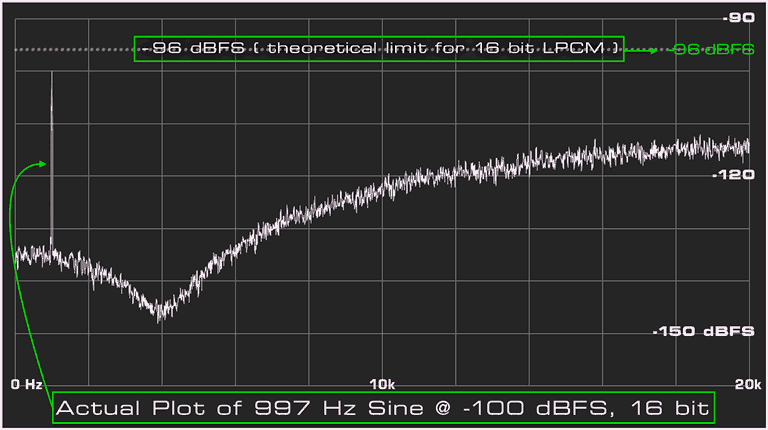 LINpro bringer visuel sikkerhed til den skjulte kunst af dithering. Vi har inkluderet virkelige plots af hver støjform for din fornøjelse. Disse er ikke MATLAB-simuleringer, de er faktiske plots genereret af LINpro’s optimerede dithering-motor. Bemærk, at -100dBFS inputsignalet, den spids på venstre side af plottet, bevares, selvom ordlængden er blevet reduceret til 16 bits. En 16-bit ord kan kun kode eller gemme 96dB dynamisk område. Enhver information, der er stilleere end -96dBFS, bør gå tabt, når ordlængden reduceres til 16 bits. Med LIN bevares op til den 19. bit af inputsignalet, indlejret i det resulterende 16-bit ord.