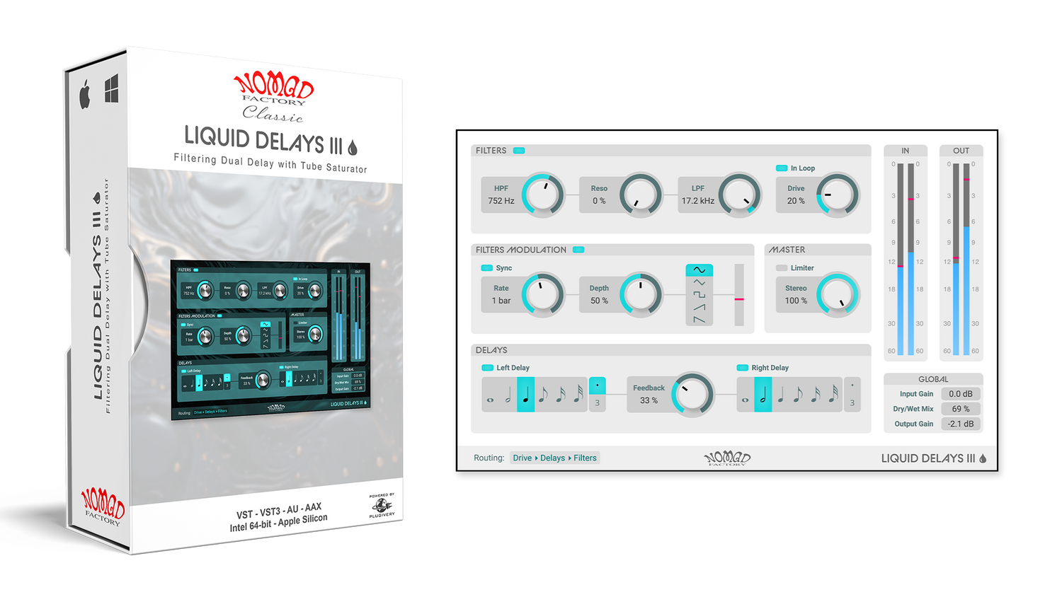 Liquid Delays III genskaber de fyldige ekkoer og rytmiske gentagelser, der definerede utallige klassiske indspilninger. Designet til at efterligne varmen fra vintage delay-enheder, tilføjer det rig, analog-inspireret atmosfære til dine numre med let kontrol.