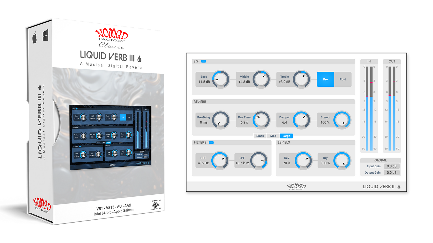 Wet/Dry mix og stereo bredde parametre giver ekstra kontrol over placering og dybde. Med sine resizable Dark og Light temaer og optimeret ydeevne, bygger Liquid Verb II bro mellem old-school ambience og moderne produktionsstandarder.