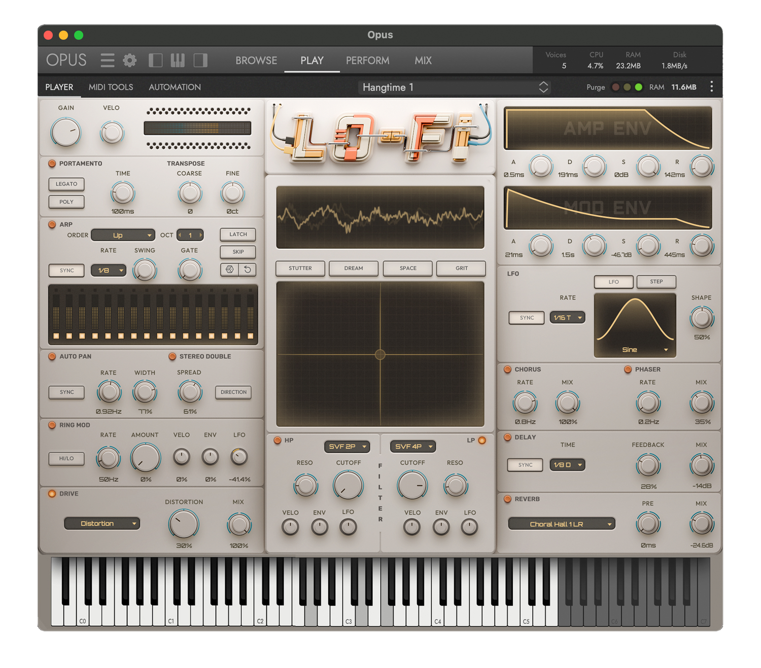 Skubbe Lo Fi til grænserne - LO-FI’s brugergrænseflade centrerer sig omkring et XY Pad med 4 valgbare Macro Effects, der ændrer flere parametre samtidigt. Ved at blande et vintage knob-per-function design med slank moderne styling, er alle af LO-FI’s kontroller let tilgængelige på en enkelt side - fra dual filtre, der kan moduleres til en avanceret 16-trins arpeggiator, en multi-mode portamento (glide), og en række effekter til at brede, pulse, forvrænge, forsinke og spatialisere den endelige lyd.