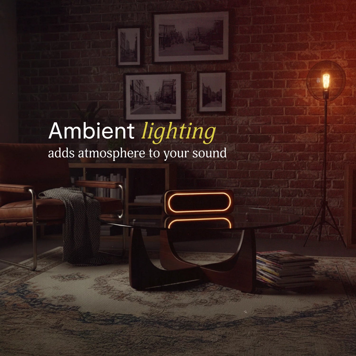 Den indbyggede LED-belysning giver højttaleren ekstra karakter og fungerer som en elegant detalje, der løfter stemningen ved både hyggelige aftener, middage og sociale arrangementer. Og med op til 10 timers batteritid behøver du ikke tænke på opladning, før festen er slut. Skulle du have lyst til at koble en pladespiller eller en anden kablet lydkilde til, klarer AUX-indgangen det uden besvær.