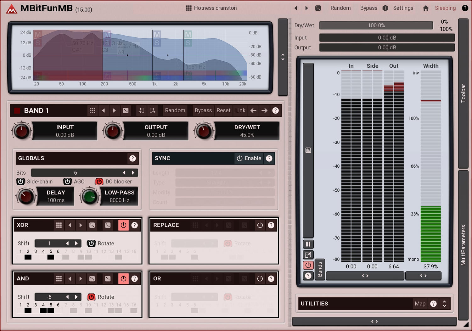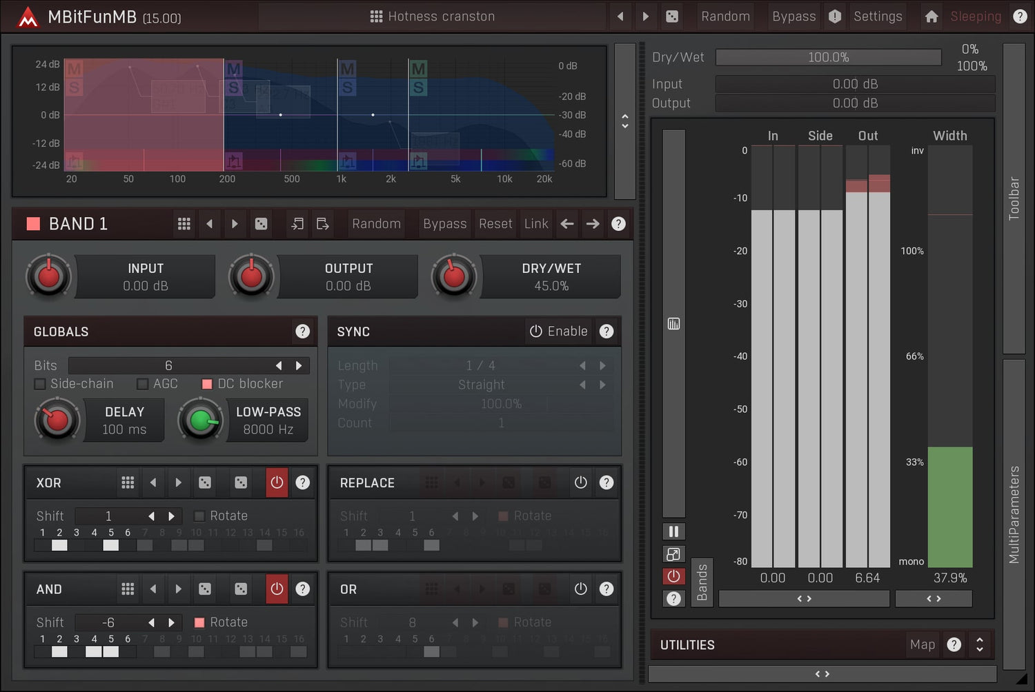 MBitFunMB er et seriøst værktøj for elskere af ekstrem distortion. Det konverterer den indkommende lyd til begrænsede faste punkt præcisionsdata på 1-16 bits pr. sample og giver dig mulighed for at tilgå hver bit med flere bit-manipulationsoperationer og afslutter behandlingen med et low-pass filter. Alt sammen med op til 6 uafhængige frekvensbånd, 4 modulatorer...