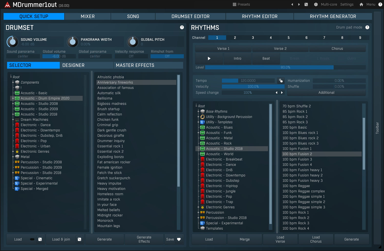 MDrummer kan generere et uendeligt antal nye trommesæt ved at trykke på en enkelt knap, analysere og importere dine samplebiblioteker, fusionere flere trommesæt og meget mere. MDrummer er perfekt, uanset om du leder efter en traditionel stil, en virkelig unik lyd tilgængelig med et par klik, eller hvis du er klar til at blive beskidt og udforske dybderne af den mest avancerede trommemaskine i verden.