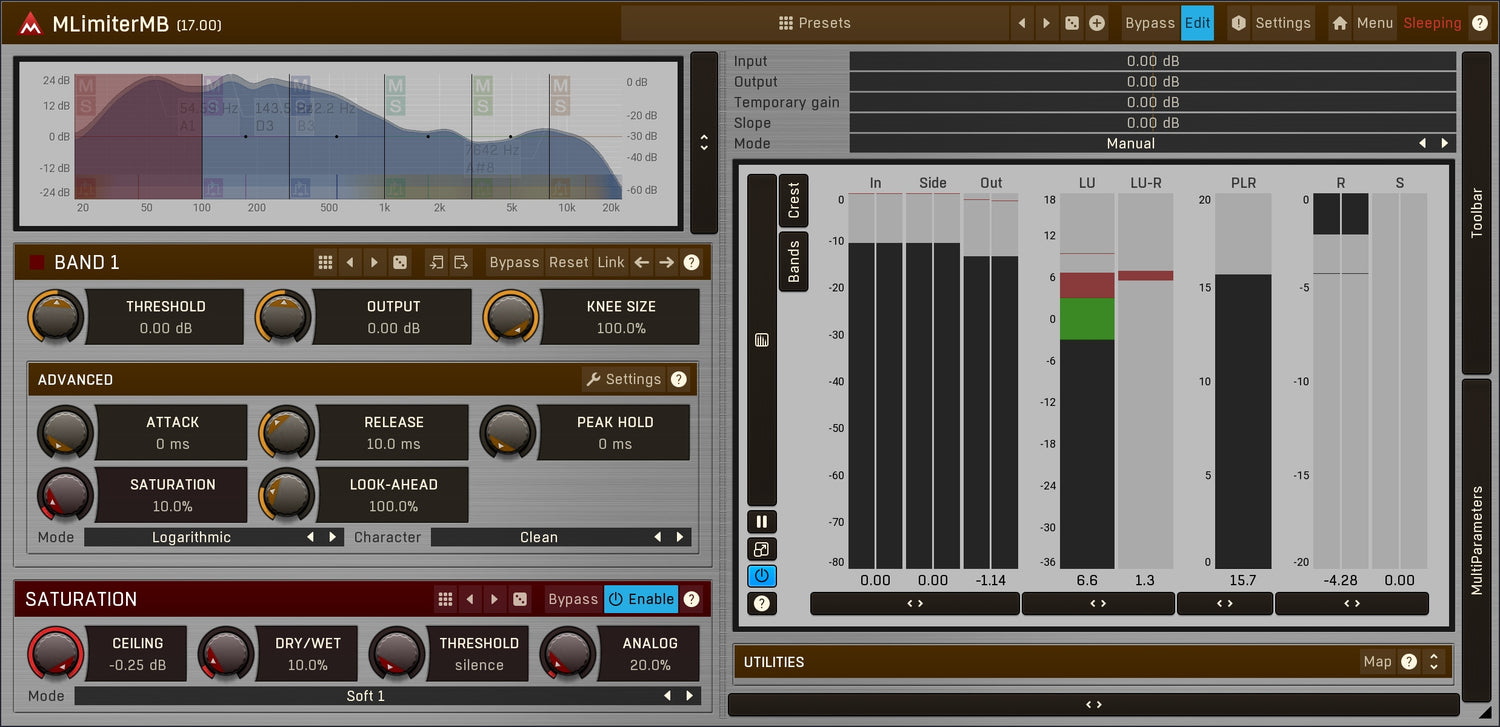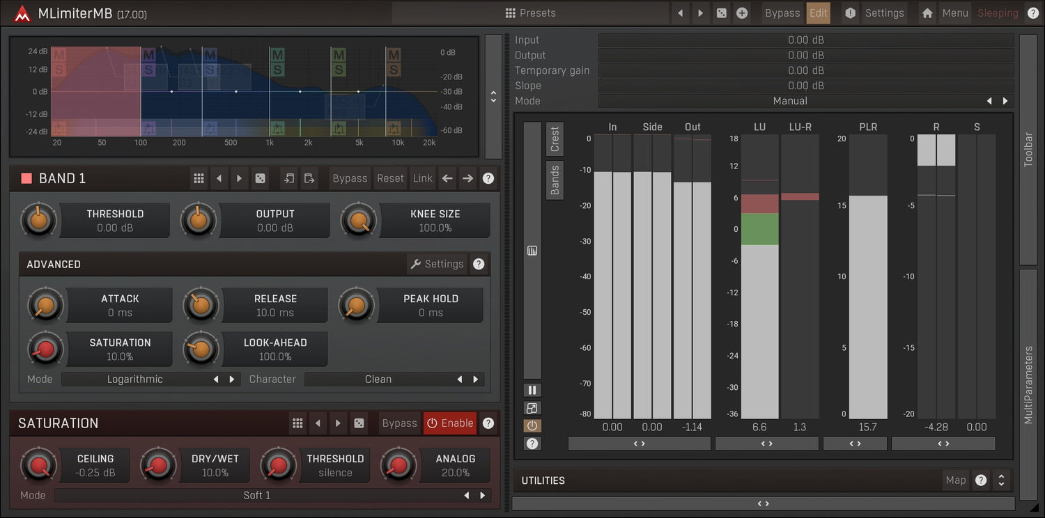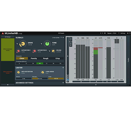 MLimiterMB har vores fantastiske saturationssystem, som kan give en behagelig analog karakter til din musik og maksimere lydstyrken.