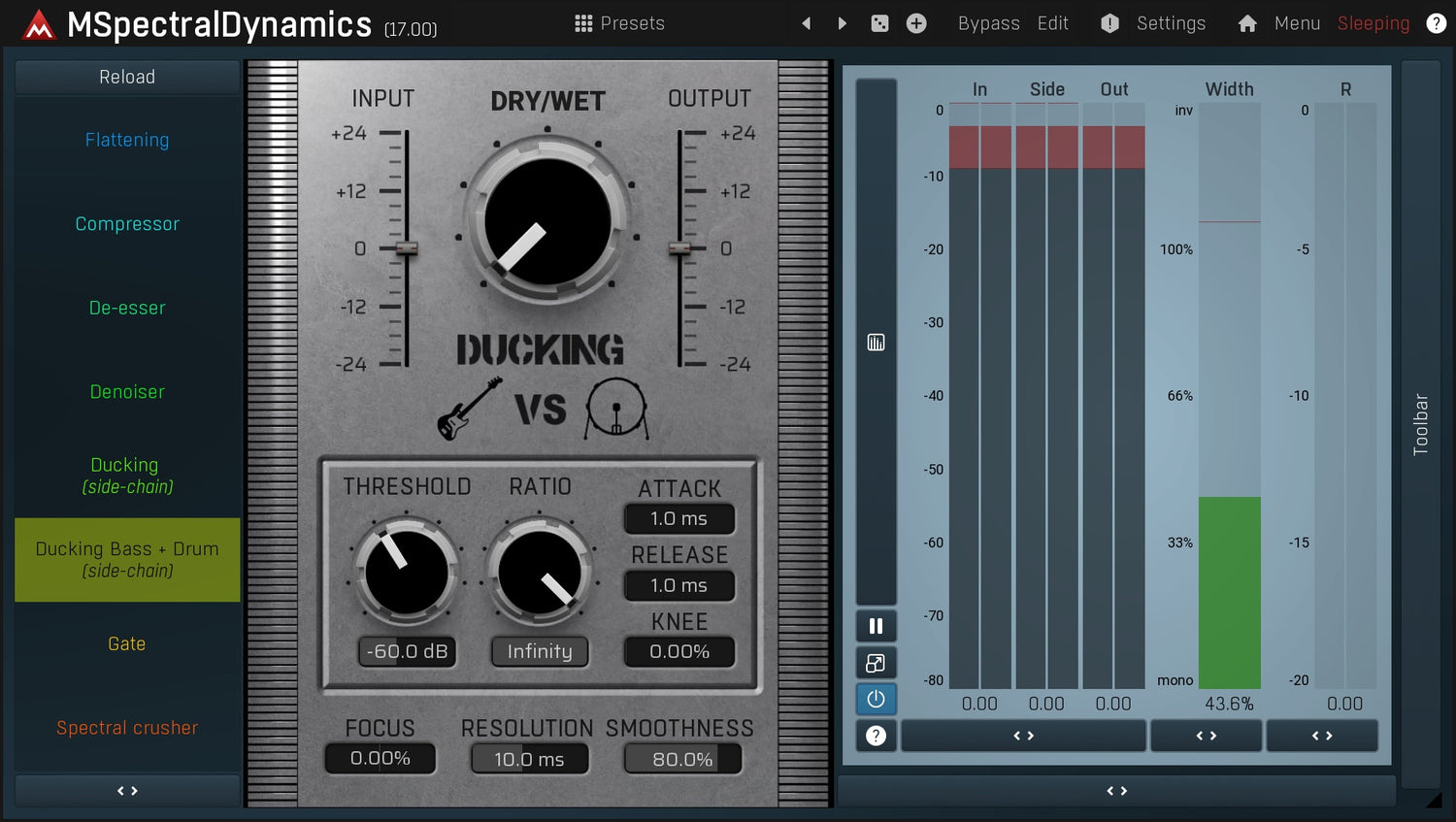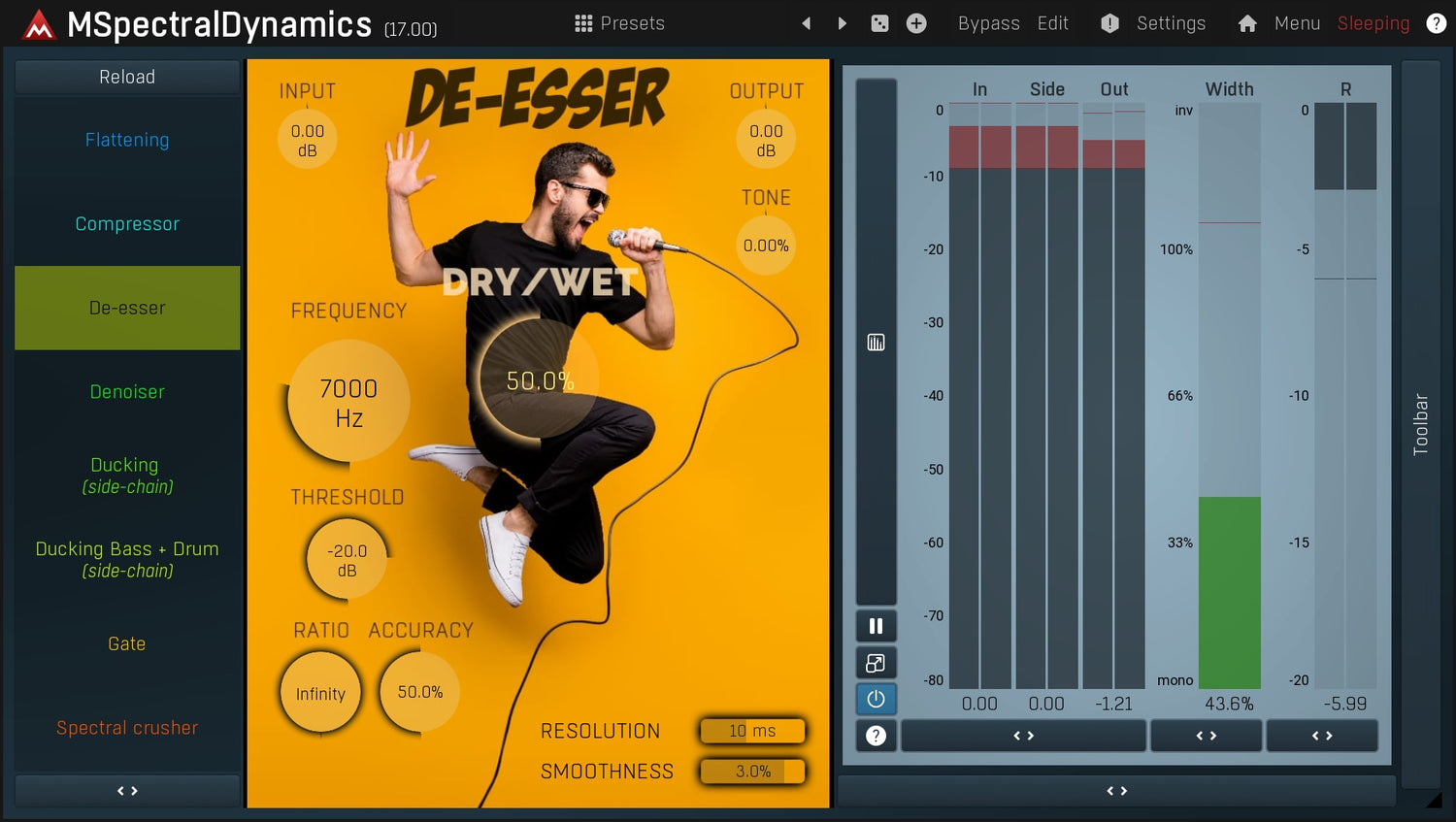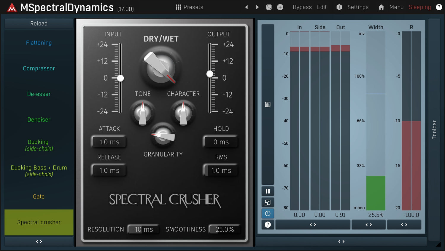 MSpectralDynamics er i bund og grund en dynamikprocessor, der arbejder i det spektale domæne, hvilket giver dig mulighed for at arbejde med individuelle frekvenser. Kompressoren kan for eksempel gøre høje frekvenser mere stille - men det er kun begyndelsen. Med MSpectralDynamics kan du forvente intet mindre end krystalklar lydkvalitet!