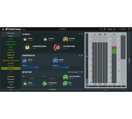 MTurboComp er den ultimative (ikke kun) kompressor, som emulerer de fleste af de klassiske vintage analoge kompressorer. Utrolig lyd, unikt hurtigt workflow, masser af ekstra funktioner.