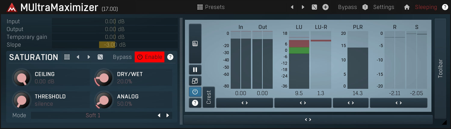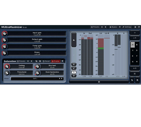 MUltraMaximizer har vores fantastiske saturationssystem, som kan tilføje en behagelig analog karakter til din musik og øge lydstyrken.