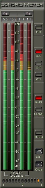 Med Sonoris Meter kan du måle peak- og loudness-niveauer af lydsignaler, samtidig på én skala. Udover en almindelig måleskala understøtter Sonoris Meter K-Systemet, fra Bob Katz, mastering engineer og grundlægger af Digido masteringstudio. Det endelige produkt følger nøje K-systemets specifikationer, herunder Leq(A) loudness-måling og båndbegrænset pink noise monitor kalibrering.
