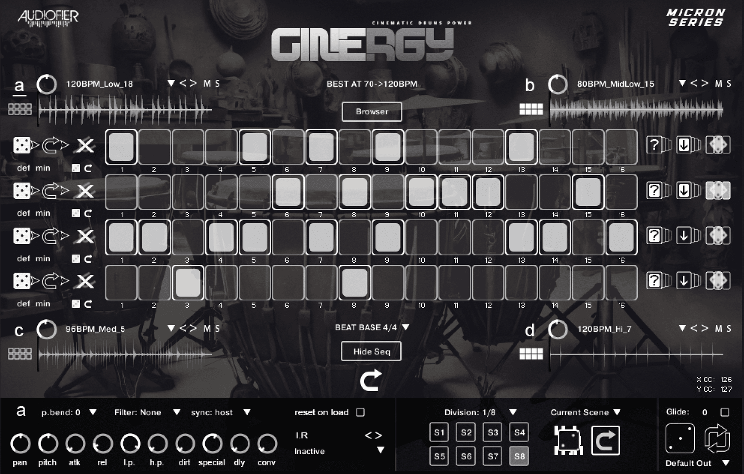 Med XY loop motoren lader CINERGY dig blande op til fire loop kilder på én gang, skifte glat mellem dem eller lagre dem for effekt. Scene Memories muliggør hurtige ændringer mellem opsætninger, så du kan bevæge dig fra tilbageholdte pulser til fuld kraft ensembler på et øjeblik.