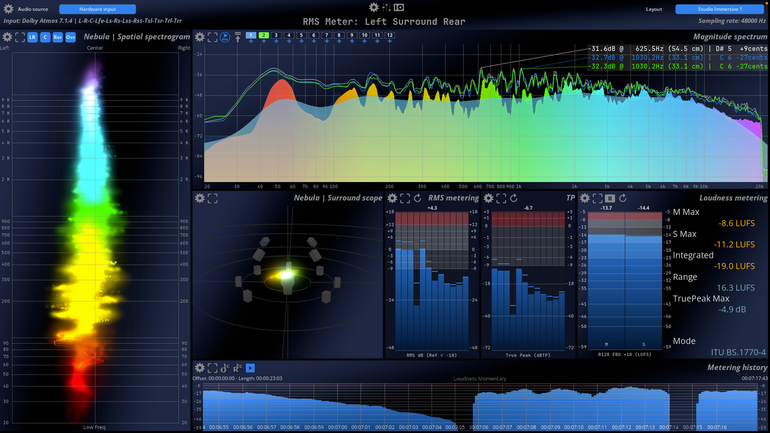 Den unikke FLUX:: Nebula visualiserer det rumlige lydfelt i et scope spektrogram til multikanalsanalyse i op til 24 kanaler.
