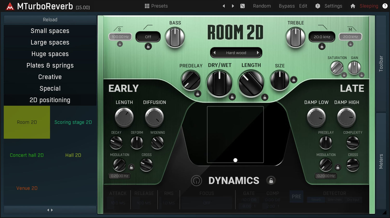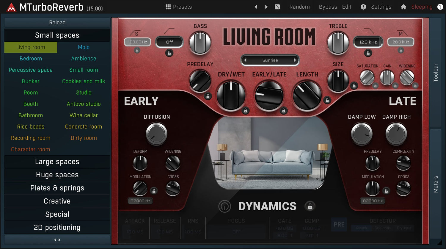 Hver af disse reverbs har alle de nødvendige kontroller såsom dry/wet eller reverb længde, men også mere specielle, såsom en dynamiksektion eller side high-pass filter. Skift mellem reverbs er kun et klik væk, hvilket betydeligt fremskynder din kreative arbejdsgang.