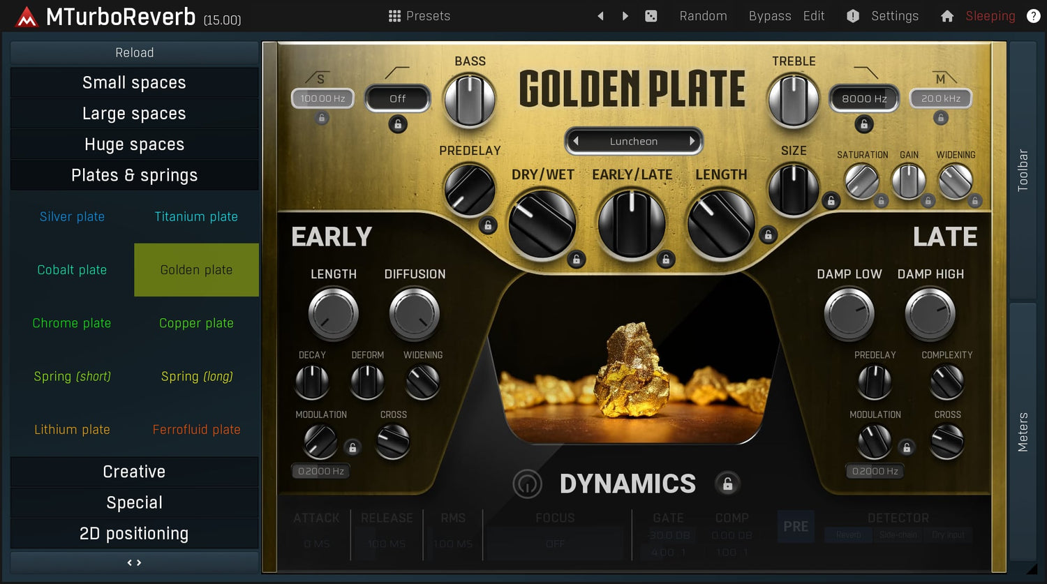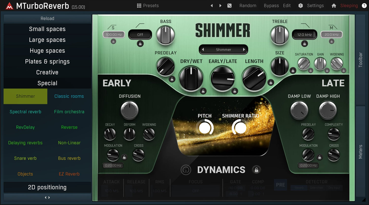 Algorithmiske reverbs er normalt baseret på en enkelt algoritme. Men MTurboReverb kommer med en revolutionerende programmerbar motor, hvor du kan designe dine egne algoritmer, men vigtigst af alt, omkring 100 af dem er allerede forberedt til dig, med en standardiseret GUI for ekstremt hurtig arbejdsgang og kort indlæringskurve. Der er alt fra rum til sale, plader, eteriske og glitrende lyde, samt 2D positionerings reverbs.