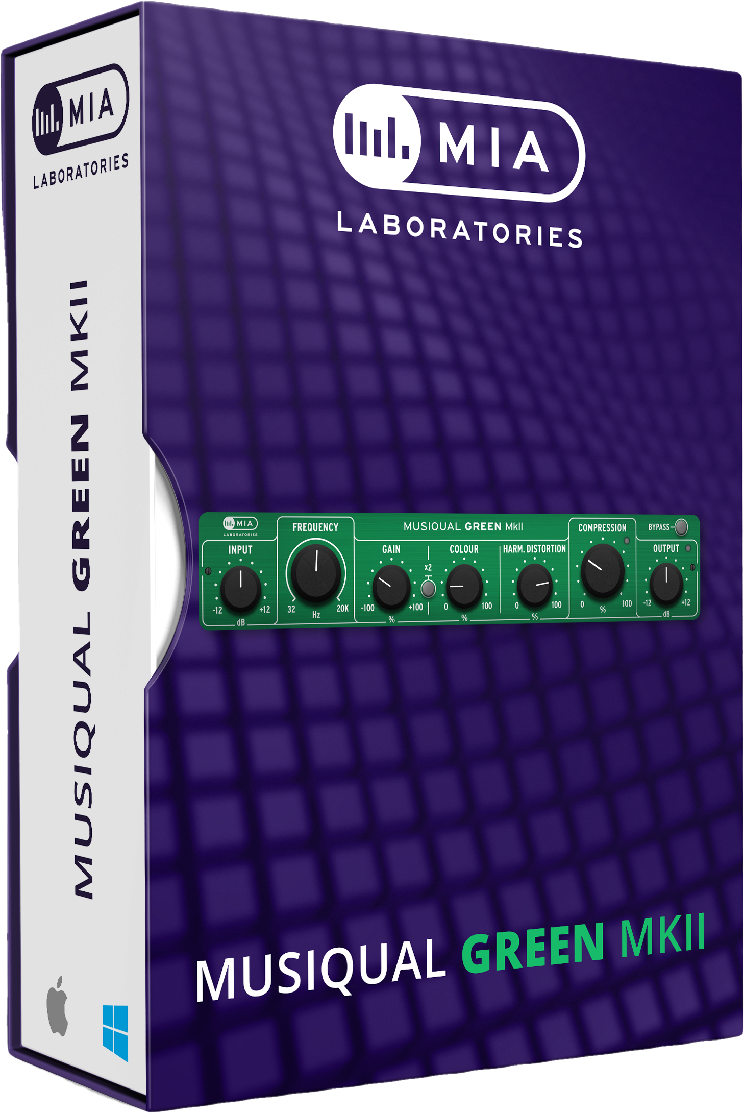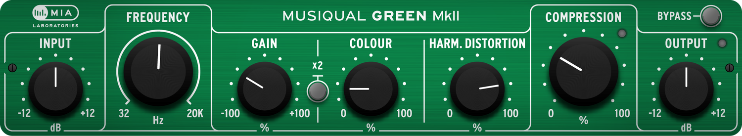 Transistor- eller op-amp kredsløbene demonstrerer en stærk komponent af “3. orden harmonisk forvrængning”. Den harmoniske forvrængningskomponent i Musiqual Green simulerer denne karakteristiske lyd; den introducerer ulige harmonikker, hvor den 3. er den mest fremtrædende. Brugeren kan præcist justere mængden af forvrængning, der tilføjes til signalet.