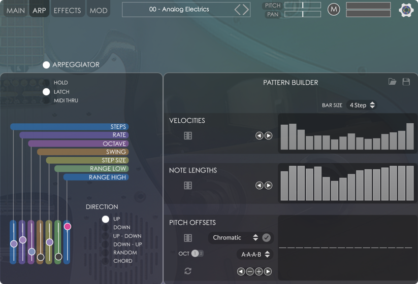 - Fully customizable Arpeggiator with Hold, Latch, and Midi Thru modes
