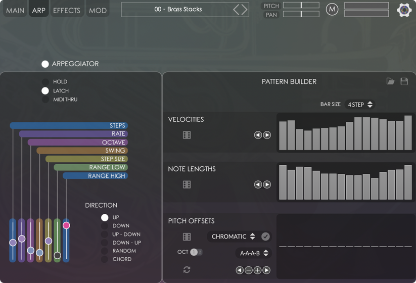 - Fully customizable Arpeggiator with Hold, Latch, and Midi Thru modes