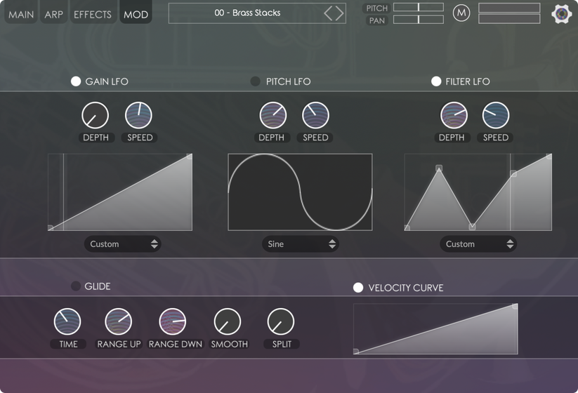 - 3 LFO’s (Gain LFO, Pitch LFO, and Filter LFO) with 6 shape options