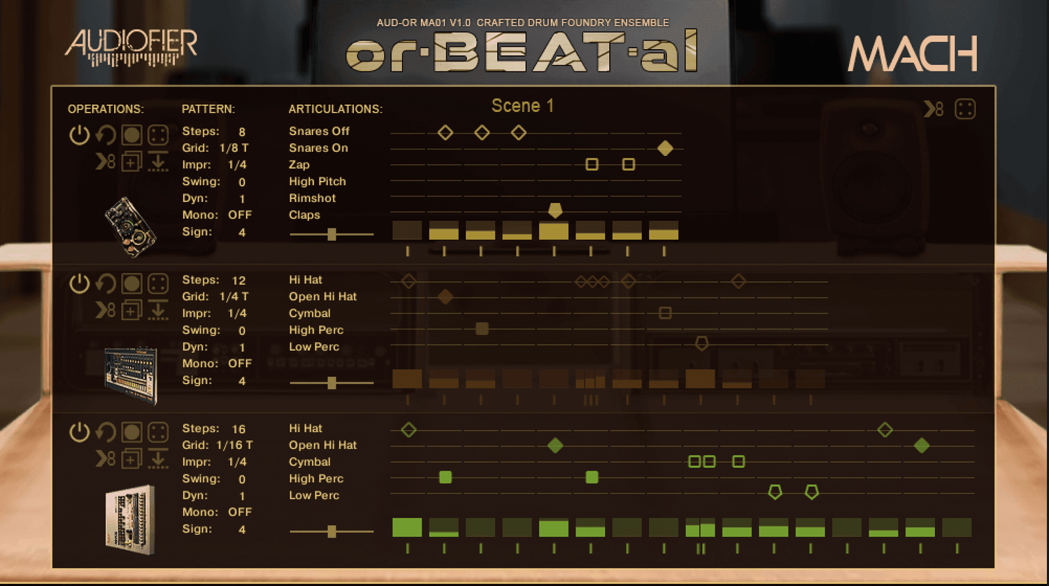 Udforsk frontlinjen af elektronisk percussion med OrBEATal Mach, en samling af lyde fra electronic drum machines og designede lyde, forvrænget og bearbejdet for at skabe et friskt twist på den elektroniske trommeverden.