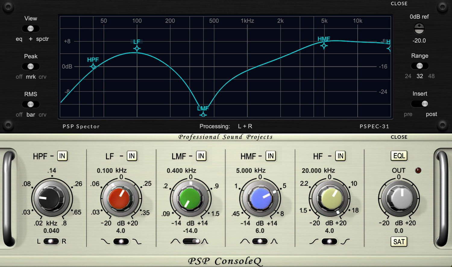 PSP ConsoleQ er en britisk konsol-stil equalizer, designet til at give en analog EQ oplevelse både i lyd og betjening. Den er perfekt til, når en ingeniør ønsker at rette eller forme lyd, eller få spor til at skille sig ud i en mix, uanset kilden.