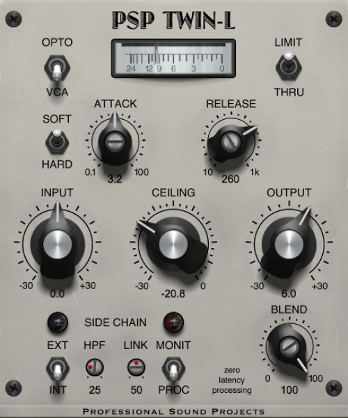 PSP Twin-L er en del af vores serie af Zero Latency Processing plugins; hvilket gør det ideelt til situationer som live monitoring, live broadcast produktion, og håndtering af niveauer under tracking.